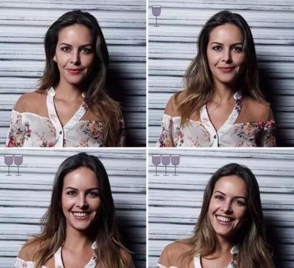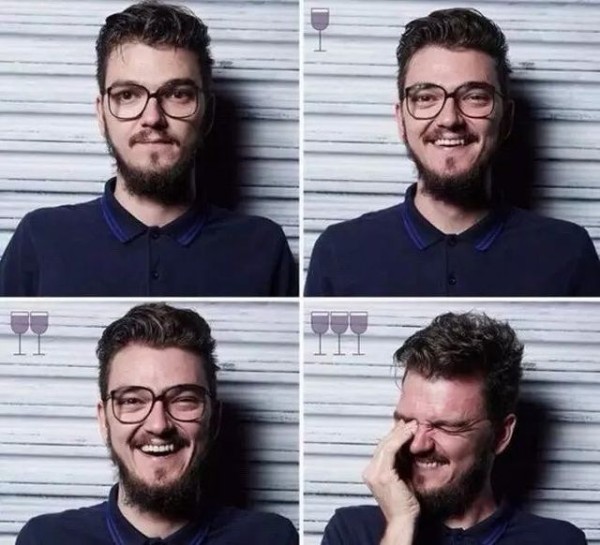 巴西摄影师马科斯.阿尔贝蒂拍下了人们在喝下1杯,2杯,3杯葡萄酒之久的表情变化,一开始人们的表情很平常,喝完第一杯后脸上每个人脸上都开始放松,喝完第二杯脸上渐渐有了笑容,喝完第三杯则完全放松,情绪也开始高涨起来。正所谓一杯随饭下,两杯爱绪浓,三杯意癫狂,喝到第三杯尽展现出微醺的迷人 。
