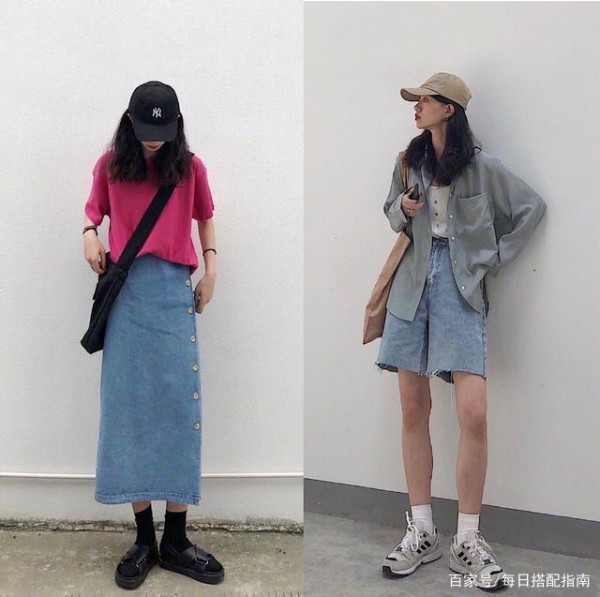 牛仔元素的单品是突出休闲简约风尚的一种经典代表,短裤或者半裙则充满着个性特色。半身裙上点缀精巧的纽扣,散发潮酷前卫风潮。毛边短裤自带清爽灵动感,闲适又洒脱。纯色短袖或者吊带衫与衬衫叠穿造型与牛仔夏装的结合都很闲适优雅。浅色的造型更适合搭配浅色棒球帽,亮色系的T恤都需要深色棒球帽进行修饰,潮酷高阶,特别拉风。