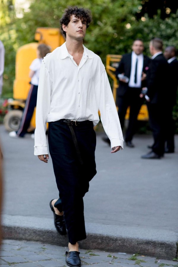 白色衬衫真的建议衣橱里一定要安排一件,纯白色可以让你拥有更多的搭配可能性,除了单穿之外,用作西装、针织马甲一类的内搭也很可以,虽然简单但却是潮人搭配中的常见款,配高腰宽松西裤,可日常可正式,完全不挑人。