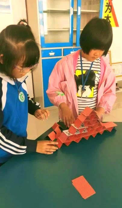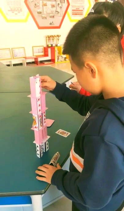 四年级的同学们,手中仅凭一盒普通的扑克纸牌,便在短短的十分钟内,于班级中构筑起一座座精巧的“纸牌高楼”。他们全神贯注地凝视着自己的杰作,轻巧而有序地拿起纸牌,以各自独特的方式向上层层叠加。
