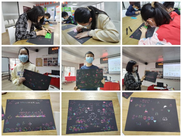 在小组尾声,社工引导组员以“人际交往”为主题进行刮画手绘,带领组员们一起回顾小组历程,巩固前几节的学习内容和经验,同时加强组员正向反馈,凝聚信任和友谊。社工鼓励组员们勇敢地刻画出在此刻人际交往中自己的心情,让组员们表达自己内心的情绪,鼓励组员将在小组中的所学所获运用到实际生活中,提高自己的人际交往能力,增强自己的自信。最后还有一个“送信”的暖心小举动。组员们将自己想要对其他小伙伴诉说的话语写在信纸上,将文字转化力量传递给他人,为此次小组画上了圆满的句号。