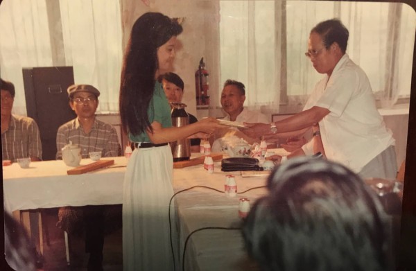 1990年6月,杭州新侨饭店,首届《西湖诗船》全国诗歌大赛颁奖会。卢文丽从冀汸先生手中接过获奖证书。(从左至右:钟高源、昌耀、唐晓渡、谢冕)