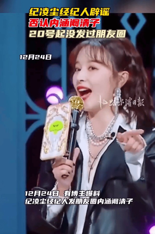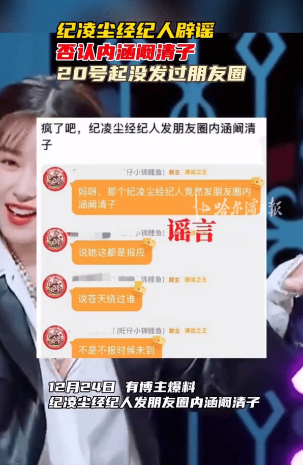 12 月 24 日,有博主爆料称,纪凌尘的经纪人曾发布朋友圈,疑似内涵阚清子。对此,纪凌尘经纪人发朋友圈辟谣称:现在真是造谣全屏一张嘴。我朋友圈从20号起就没有发过任何东西。我都是别人发了链接才看到的新闻。老纪更是不上微博的人。截图都没有半张就敢造谣,真的是无法无天。