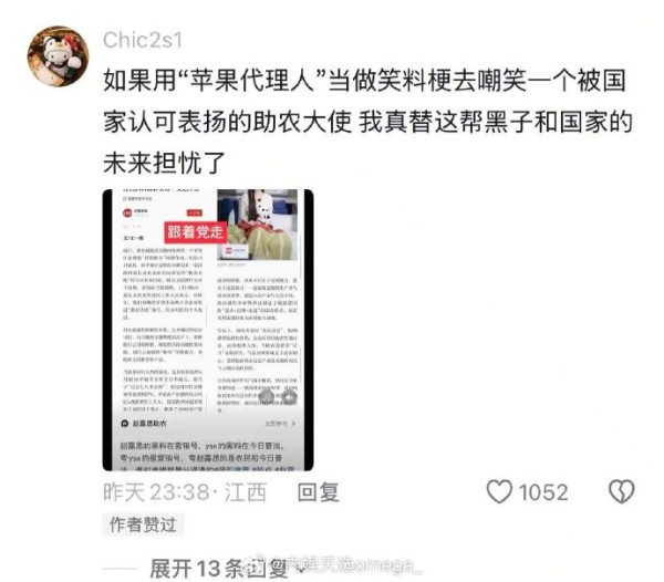 赵露思回应被嘲苹果代理人,称担忧黑子与国家未来
