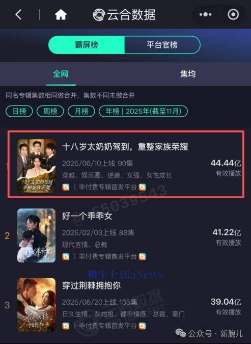李柯以手握《十八岁太奶奶驾到,重整家族荣耀》和《夫人她专治不服》系列,稳坐“短剧一姐”。她是双破亿短剧最多的女演员,也是红果破20亿、30亿短剧最多的女演员!据了解,《太奶奶》系列总播放量超120亿,其中《太奶奶1》播放量超50亿,是当之无愧的2025短剧剧王、年冠,而李柯以则是当之无愧的年冠王。