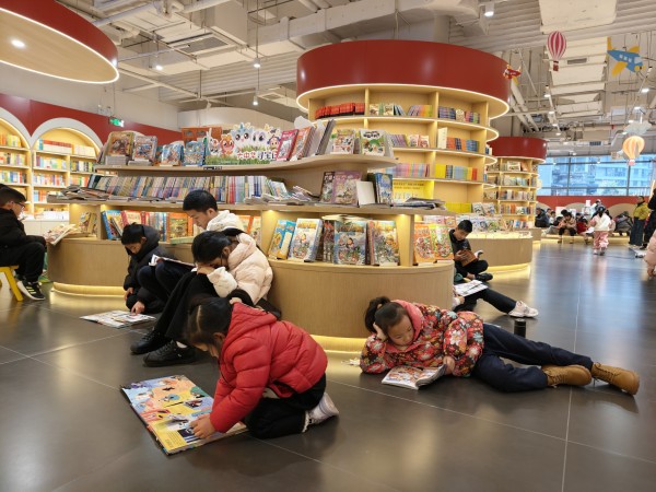 作为成都老牌大型书城,西南书城的元旦氛围格外浓厚。1 月 1日上午 10 时,记者刚走进书店大门,就被熙熙攘攘的人群所吸引。书架间穿梭着不同年龄段的读者,有的站在书架前凝神翻阅,有的坐在角落的休息区静心品读,不少孩子干脆直接躺在地上,捧着绘本看得津津有味,小脸上满是专注。
