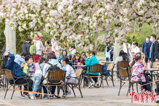4月的北京动物园内,人们在露天休息区休息、交流、吃饭。林天羽/摄