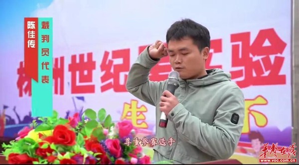 本次运动会裁判员代表陈佳传老师上台进行宣誓,他鼓励运动健儿们勇争第一,充分展现自己的运动魅力,尽情享受运动带来的快乐,同时也要时刻注意安全。