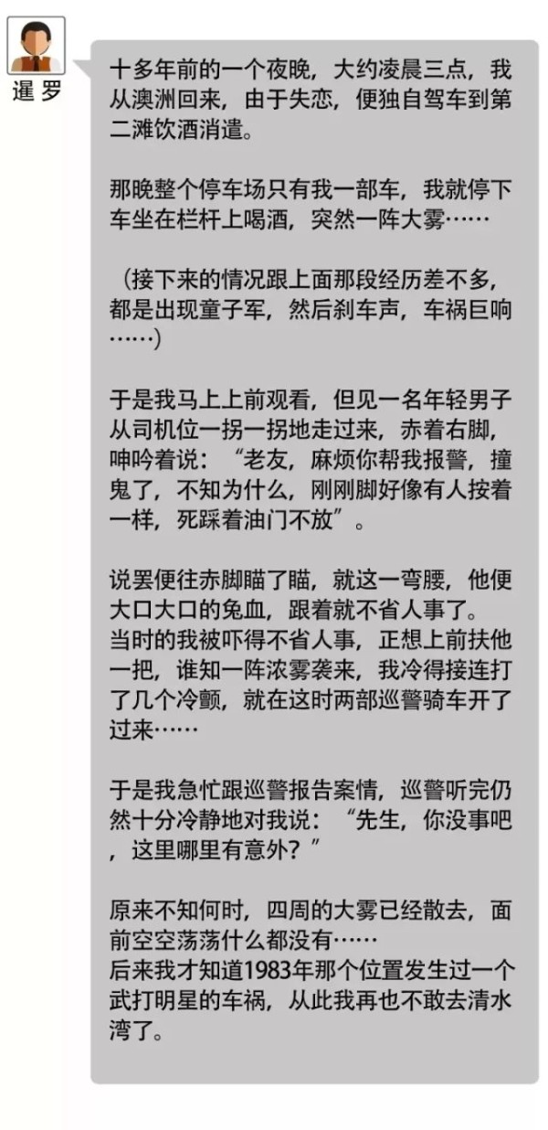 第一点肯定是遇到不干净的东西了,还是一群。同样的,事情发生后,也不断有人说在这里看到一群鬼,我们不妨看看早点香港一档深夜灵异节目中,3位听众对于这件事的投稿: