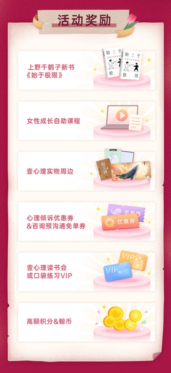为了鼓励更多人关注和思考女性成长和活出自我的必要性,活动特设邀请新朋友专属奖项,通过指定页面邀请朋友加入,在原有的规则之外,追加壹心理周边奖励。