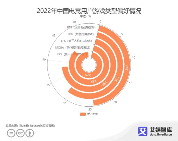 iiMedia Research(艾媒咨询)数据显示,在2022年中国电竞用户游戏类型偏好情况中,52.2%消费者会选择FPS(第一人称射击游戏),45.8%消费者会选择MOBA(动作即时战略游戏),38.3%消费者会选择TPS(第三人称射击游戏),31.1%消费者会选择RPG(角色扮演游戏),24.2%消费者会选择RTS(回合制战略游戏)。