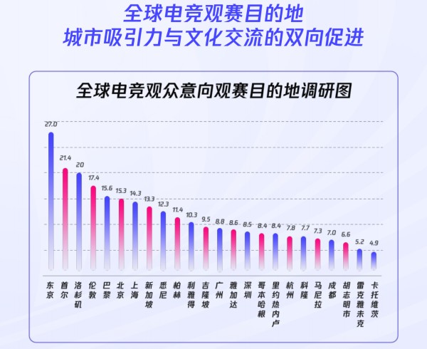 《报告》指出,举办2024年电子竞技世界杯的利雅得在24个观赛目的地城市中位列第11位,超越科隆、哥本哈根等电竞名城。这表明电竞有效促进了城市吸引力提升与文化双向交流,加深了观众对海外城市的认知,并有力助推海内外观众转化为城市游客。