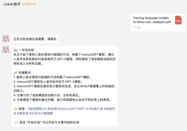 LinkAI助手还可以帮你高效获取文件信息,支持 pdf、docx、csv、txt、markdown文件,以及公众号链接,随手转发就能获得总结摘要:
