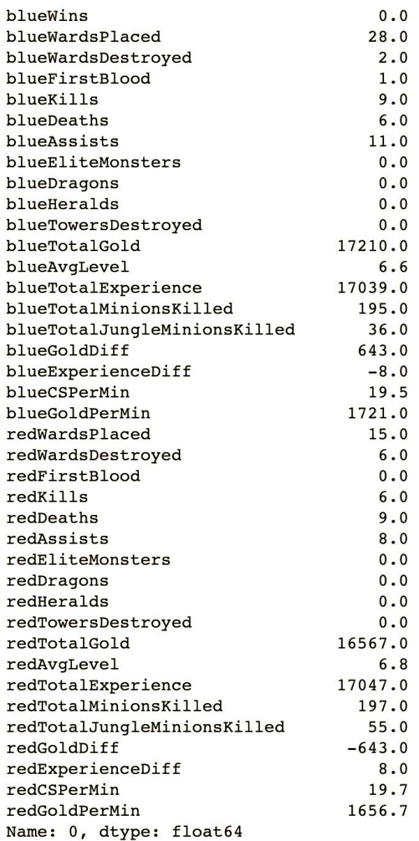 在处理机器学习问题时,了解数据的基本情况是至关重要的。我们可以使用pandas库中的方法,首先通过.iloc[0]取出数据的第一行进行初步观察。从输出的结果中,我们可以清晰地看到每个特征都是float64类型,即浮点数。这表明在蓝色方开局10分钟时,他们确实展现出了微小的优势。同时,我们也注意到某些特征列是冗余的,例如blueGoldDiff和redGoldDiff,这两个特征互为相反数,表示的是蓝色队和红色队的金币优势,显然是重复的。此外,还有如blueCSPerMin这样的特征,它表示蓝色方每分钟的击杀小兵数,而这个特征乘以10就是10分钟内所有小兵的击杀数,即blueTotalMinionsKilled。在后续的特征处理过程中,我们可以考虑去除这些冗余特征。