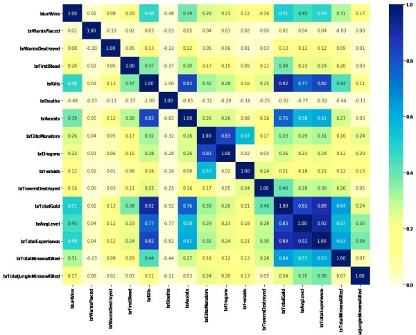 另外,pandas提供的describe()函数非常实用,它可以轻松地展示每一列数据的统计信息。通过这个函数,我们可以对数据的分布情况有更全面的了解。例如,对于蓝色方的击杀英雄数(blueKills),在前十分钟的平均数是6.14,方差为2.93,中位数为6,且在超过百分之五十的对局中,该特征的值都在4到8之间。这些信息对于后续的数据分析和模型训练都非常有价值。计算特征之间的相关系数,评估特征的重要性,为模型选择合适的特征。
