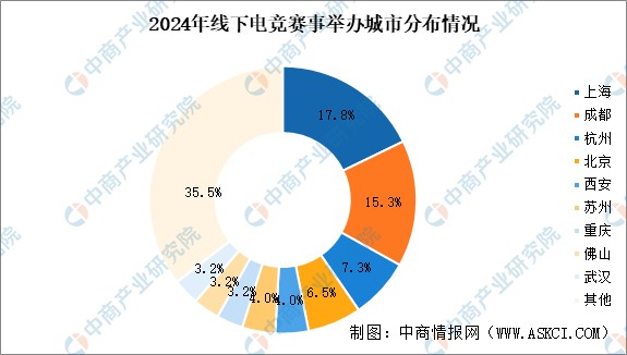 2024年,省级及以上电子竞技非表演性质的比赛共有124场。其中,58%为线下赛事,32%为线上线下结合、10%为线上赛事。上海举办的线下比赛数量最多,占比达17.8%。成都、杭州和北京也在赛事举办中起着重要的作用,分别占比15.3%、7.3%和6.5%。