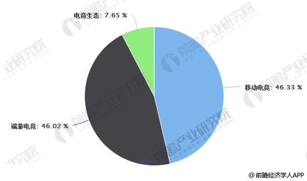 前瞻产业研究院数据显示,2017年中国电竞市场规模中,移动电竞游戏市场规模达303亿元,占整体市场规模的46.33%;端游电竞市场规模达到301亿元,占比为46.02%;电竞生态市场规模为50亿元,占中国电子竞技整体市场规模的7.65%。
