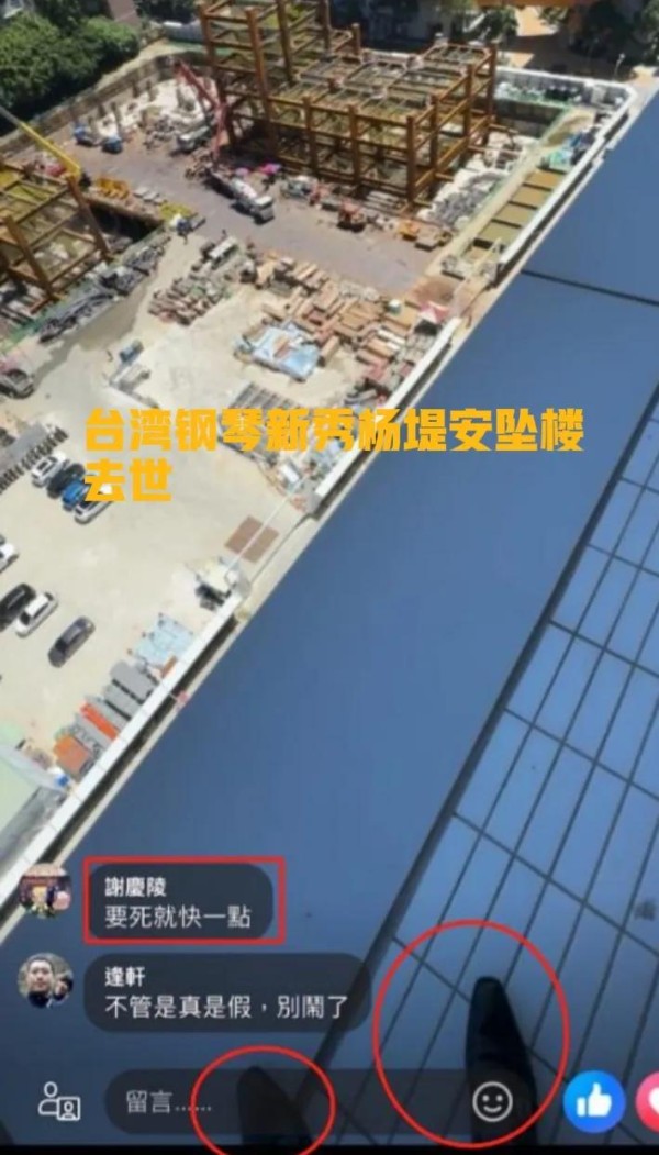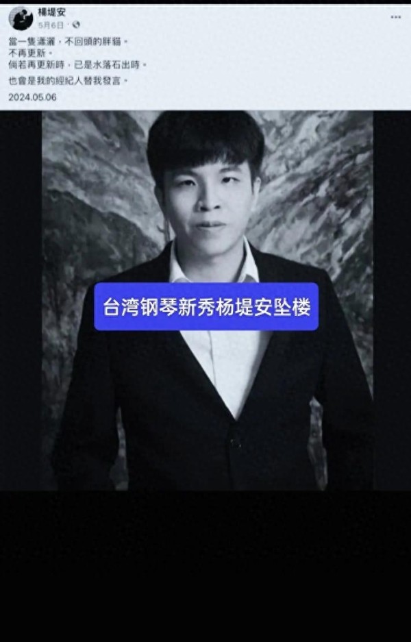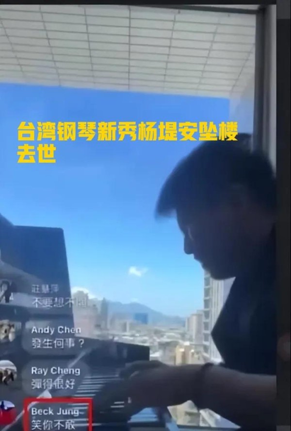 8月21日上午,现年29岁的台湾钢琴家杨堤安在社交媒体上进行了一场直播,向观众宣布这将是他在“自杀前的最后一次直播”。在直播过程中,面对杨堤安的决定,一部分网友试图安抚他,而另一部分网友则发表了冷漠甚至带有挑衅性质的言论。直播结束后不久,杨堤安被发现从位于土城的16楼住处坠落,不幸离世。