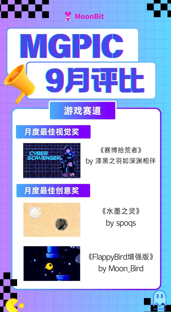 MGPIC游戏赛道9月获奖作品震撼揭晓!在激烈的角逐中,几款佳作凭借卓越表现脱颖而出,成为月度之星。其中,“赛博拾荒者”以其独树一帜的赛博朋克美术风格和电子配乐,完美契合游戏主题与玩法,强烈的节奏感和畅快的反馈让玩家们大呼过瘾。“水墨之灵”则是对经典游戏duet的致敬之作,巧妙融入创新元素,拓展了玩法边界。同时,它巧妙地结合了阴阳、水墨的概念,为玩家带来别具一格的体验。“FlappyBird”则是在原有经典游戏的基础上进行大胆创新,通过增加道具使用、丰富模式和背景,让玩家在游戏中享受刺激与乐趣。随机出现的道具让小鸟的冒险之旅充满惊喜与挑战,令人欲罢不能。