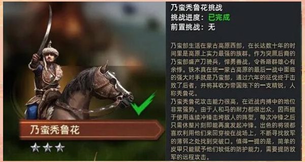 乃蛮秃鲁花在密集阵型的支持下,冲锋能力大增,冲锋伤害变得极高,甚至能轻松冲破大多数步兵的防线。其冷却时间也大大缩短,使得乃蛮秃鲁花在战场上更为灵活多变。但由于防御能力较弱,且持续输出能力卓越,因此在使用时需特别警惕远程群体的攻击。