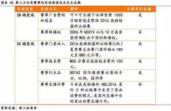 尽管如此,一些第三方赛事运营机构已经开始试水相关变现渠道。阿里体育主办的WESG的全球官方主播台权益(包括转播信号制作和转播权)以3500万的价格出售给了ImbaTV。NeoTV和斗鱼在2016年NSL星际争霸2职业联赛的决赛转播上采取了“原画收费”的模式,创造了约10万元的收入,但相比起300万的赛事总奖金,显得十分微不足道。