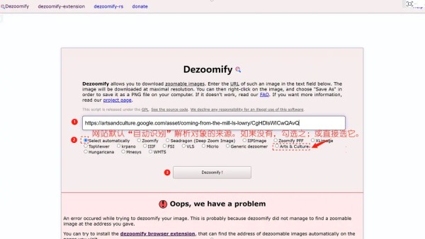 ②前往 Dezoomify https://dezoomify.ophir.dev/粘贴网址,提交后等待解析完成,便可下载高清原图。