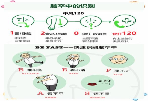 使用“中风120”口诀快速识别中风症状,并及时采取行动给予中风患者黄金抢救机会。“1”是观察一张脸是否对称,口角是否歪斜;“2”是查看两只手臂是否平行举起,单侧是否无力下垂;“0”是聆听语言是否清晰,表达是否困难。一旦出现这些症状,应立即拨打120,争取抢救时间。