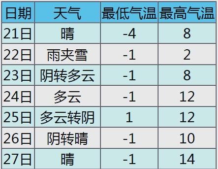 具体天气预报如下:预计今日夜间至明日白天,全市以晴间多云为主,最低气温方面,市区及坝下将达到-6~-3℃,坝上地区则为-12~-9℃,最高气温方面,市区及坝下为7~10℃,坝上地区为2~5℃。到了10月22日,阴天将伴随小雪或雨夹雪,局部地区可能出现中雪,气温持续低迷。而到了10月23日,阴天将逐渐转晴,局部地区有零星小雪。请市民朋友们密切关注最新天气预报,做好出行准备。