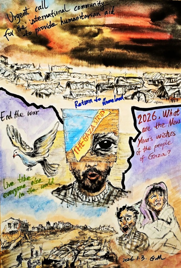 图1 巴勒斯坦人在流离失所中迎来2026,加沙民众的新年愿望是什么? 纸本彩墨 65cm X 45cm 李公明 作 2026年1月3日