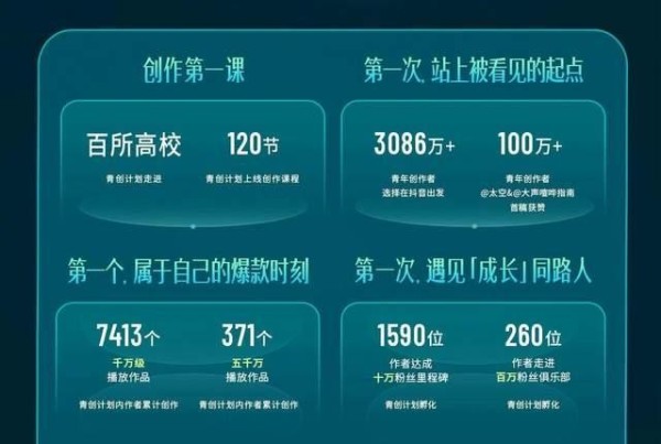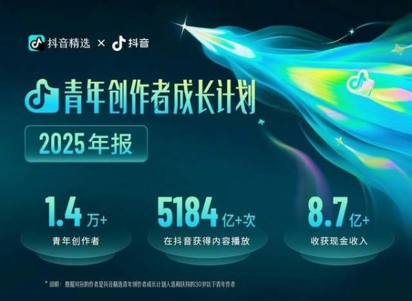 2025 年收官之际,抖音精选青年创作者成长计划(下称 “青创计划”)交出亮眼成绩单:1.4 万名青年创作者通过该计划获得超 8 亿元现金收入,作品累计播放量突破 5000 亿次,260 位作者跻身“百万粉丝俱乐部”,1590 人粉丝量破十万。