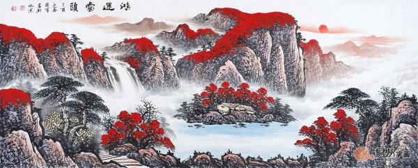 客厅,装饰一幅红色的字画,能够很好带动客厅装饰的氛围,有红红火火、热情待客之说。这幅蒋伟的聚宝盆山水画,以左青龙、右白虎、前朱雀、后玄武为格局,具体的格局为:背倚玄武——主山,是连绵起伏的群山,也就是所谓龙脉;两侧有重重山脉相拱卫,即“青龙”“白虎”;前有朱雀——前有开阔水面,河水蜿蜒而绕过,预示着财运滚滚,源远流长。这幅红色的聚宝盆山水画还是很好客厅风水字画。
