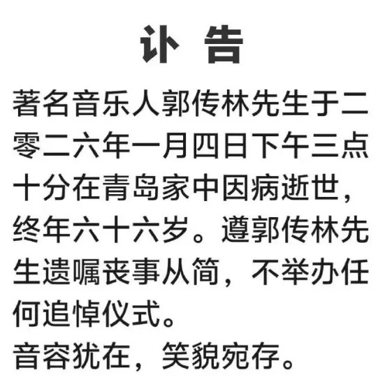 1月5日,黑豹乐队成员赵明义对外发布讣告,证实乐队创始人郭传林已于前一日在青岛离世,终年66岁。