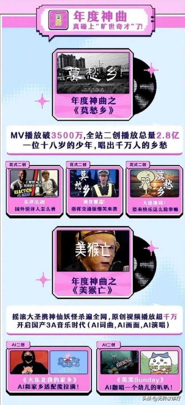 不光这俩,B站、快手也没闲着,《2025 B站音乐年度生态报告》显示,其音乐视频播放量超997.16亿次,快手万粉达人一年就产出46亿条带BGM的视频,《莫愁乡》《弥渡山歌》全是靠二创火遍全网的。