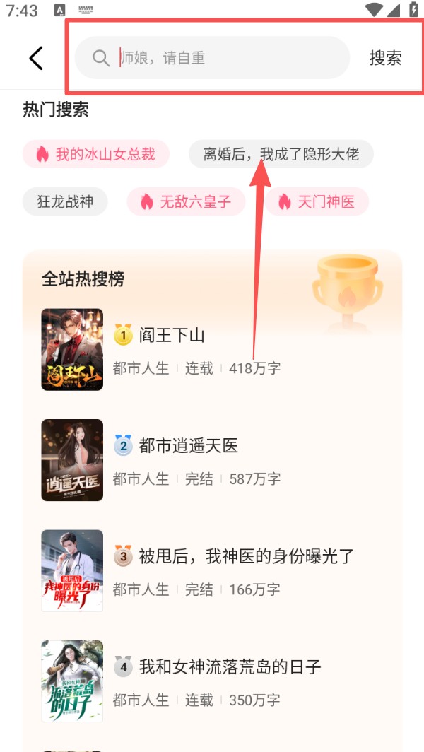2、进入搜索页面后,能看到热门搜索和全站热搜榜,可选择感兴趣的小说进行搜索。