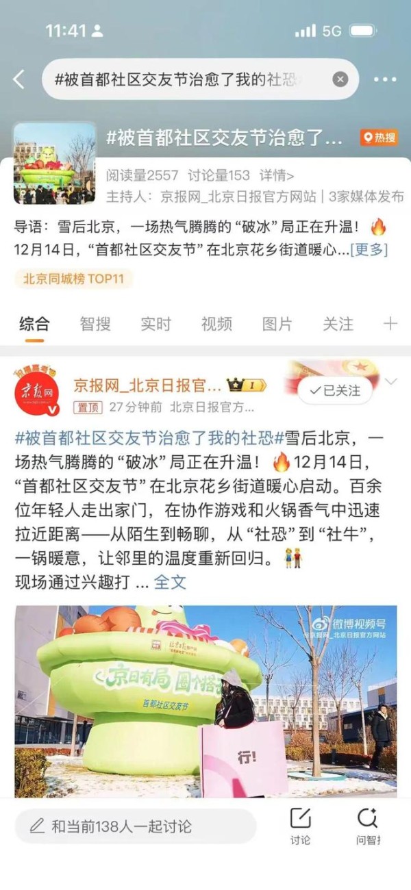 首场活动便吸引百余位青年参与,北京卫视跟进报道、抖音同城榜#被北京年轻人的搭子生活羡慕到了# 持续发酵,微博热搜话题引发全网讨论,华润有巢君工无忧社区里,火锅冒着热气,大家聊得热热闹闹,以前低头不见抬头见的邻居,这下总算不是最熟悉的陌生人了。