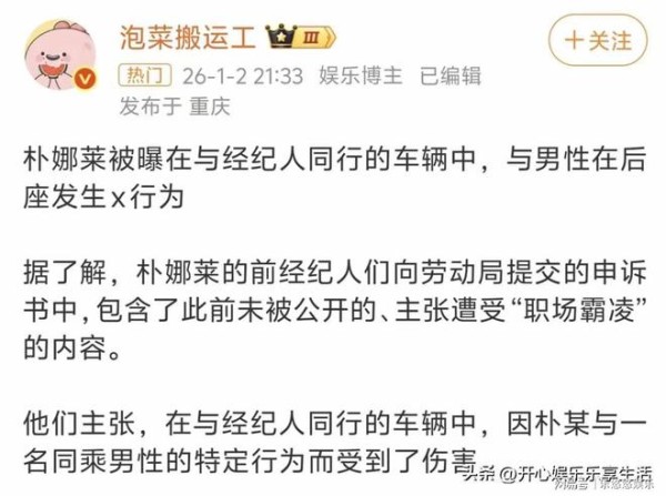 朴娜莱被曝前经纪人爆料,在车后座与男性发生亲密关系,完全不顾司机与前经纪人的存在。