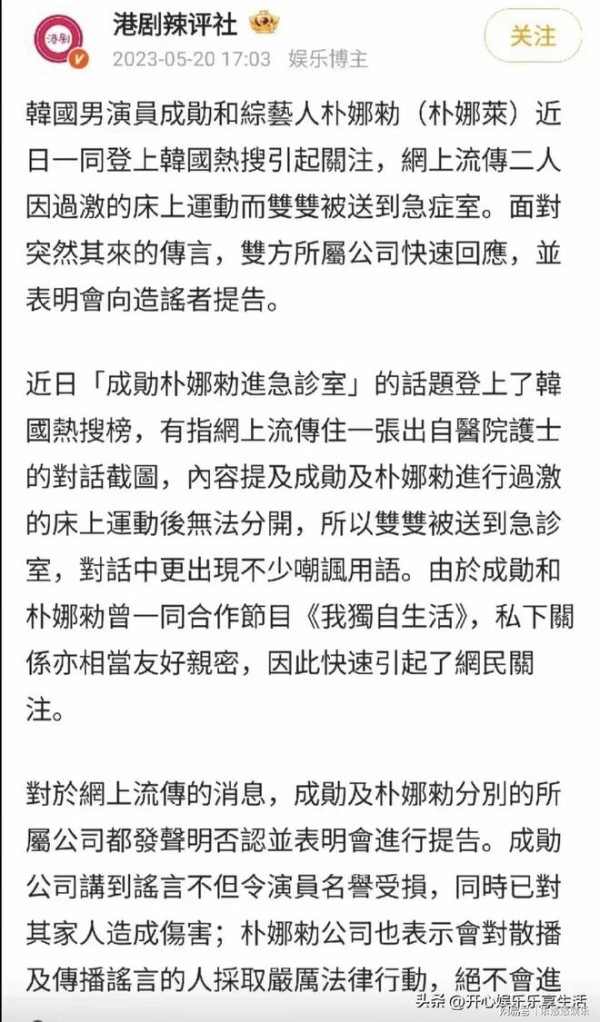 行为方式夸张大胆,这让我不禁觉得越离谱的爆料越真。早在2023年,“成勋朴娜莱进急诊室”的词条轰动网络。