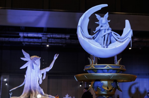 步入展会现场,仿佛穿越次元之门。在月之三版本中人气颇高的“月神”哥伦比娅——代号“少女”,此次以6.5米高的雕像形态出现。“少女”静静矗立,裙摆随风轻动,还原出“祈月之夜”的唯美氛围,身着相关COS元素的玩家还能解锁专属NPC互动。“咬咬霜鳍鲸”“魔女的游戏”等摊位也复刻了游戏场景,吸引玩家排队打卡。