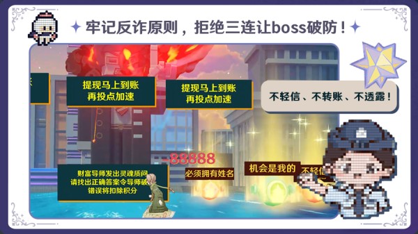 特别设置的公安联动公益专区也因为与游戏的趣味融合而人气颇高。这里将反诈知识融入游戏任务,玩家通过“双人配合跑酷”的模式,躲避印有诈骗话术的障碍,逐步揭开骗局真相,并以反诈口诀作为武器对抗敌人。“这种形式很新颖,玩着玩着游戏就被‘不轻信、不转账、不透露’的口号‘洗脑’了。”一位刚刚通关互动游戏的玩家说。