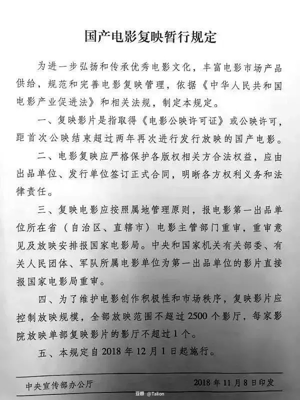2018年12月起电影局颁发了《国产影片复映暂行规定》,全文如下: