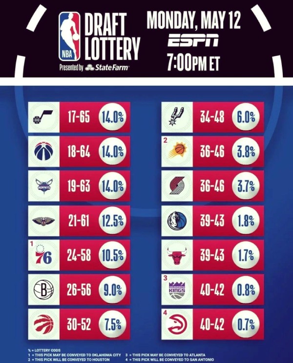 NBA乐透抽签揭晓:火箭摘探花,老鹰逆袭状元?活塞错失前四