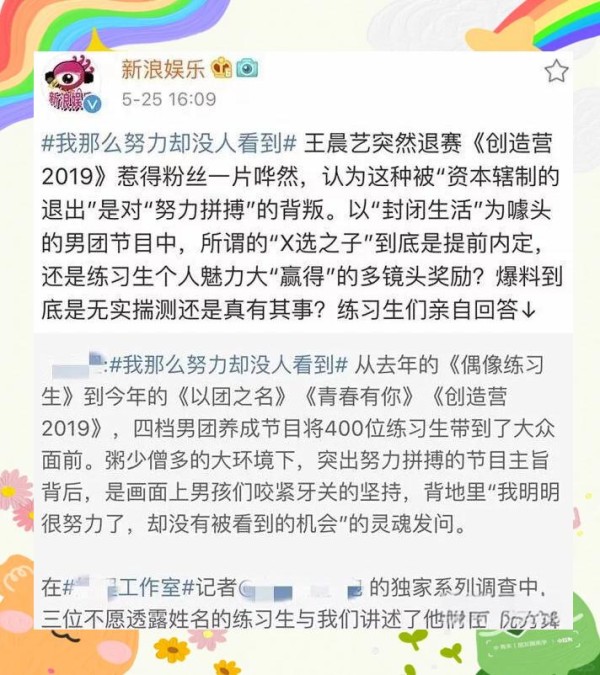 在这看似公平的竞争舞台上,实则隐藏着诸多“规则”,而这里所发生的一切,往往比我们想象中的还要现实。例如,近期闹得沸沸扬扬的练习生 王晨艺因出色表现受到攻击,节目组对此给出的解释引起粉丝怀疑,他被迫退赛事件,就令众多粉丝感到难以置信。