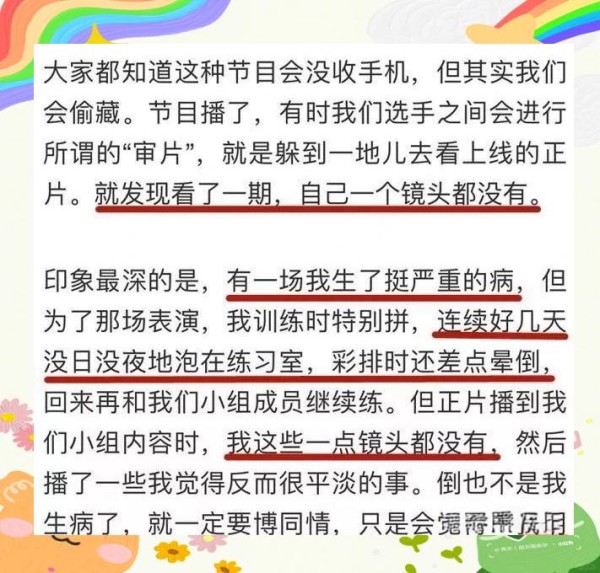 练习生在节目中面临的不平等镜头展示,使得他们的努力难以被观众看到,进一步加剧了竞争。在封闭的环境中练习时,尽管节目组会收走手机,但仍有选手试图偷偷携带。他们会在角落或厕所里偷偷观看节目的正片,仔细审视每一个镜头,然而却发现自己的身影始终未出现。这种感受,或许只有身处其中的练习生才能深切体会。