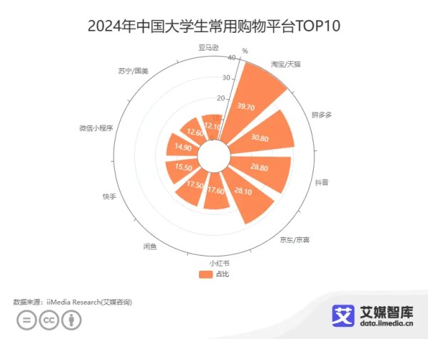 iiMedia Research(艾媒咨询)数据显示,在2024年中国大学生常用购物平台TOP10中,39.70%消费者会选择淘宝/天猫,30.80%消费者会选择拼多多,28.80%消费者会选择抖音,28.10%消费者会选择京东/京喜,17.60%消费者会选择小红书。