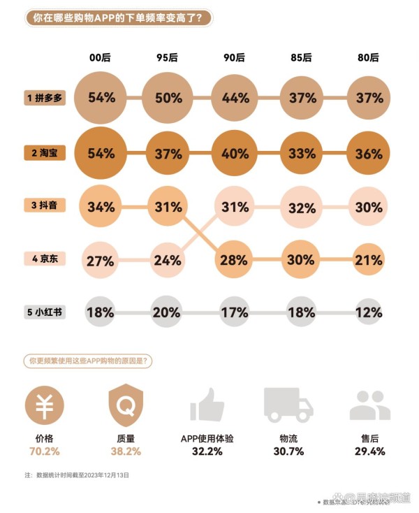 DT研究院调研数据显示,2023年消费者更频繁使用的购物软件TOP5为:拼多多(45.8%)、淘宝(40.3%)、抖音(29.9%)、京东(28.1%)和小红书(17.5%)。价格是驱使消费者使用拼多多最普遍的理由。