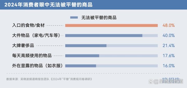 为了进一步研究当前消费者对于日常消费和贵价消费之间区隔的理解,2024年3月,吴晓波频道发起了“2024平替消费观”问卷调研。在问卷中,我们向受访者们提问:“哪些商品在你眼中无法被平替?”