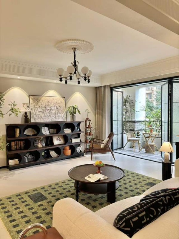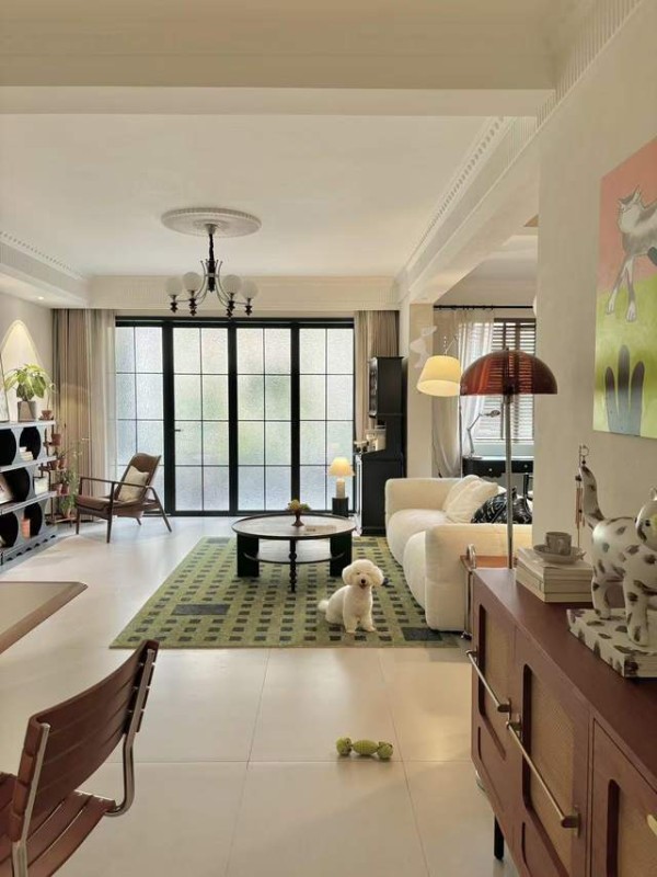 地面通铺浅米色哑光砖,哑光材质的细腻质感与浅米色的柔和色调,让空间显得温暖而舒适,同时哑光砖的耐脏性与耐磨性,也满足了现代家居的实用需求。为了避免地面过于单调,设计师在客厅沙发区域铺设了一张复古绿几何图案地毯,地毯的方格纹样与中古风的经典图案相呼应,复古绿的色彩则与墙面壁龛、软装中的绿色元素形成统一的色彩体系。地毯的毛绒质感与哑光砖的硬质质感形成对比,冷暖色调的碰撞让空间的层次感更加丰富,也让客厅的休闲氛围更加浓厚。