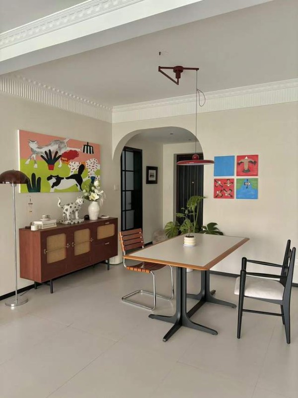 顶面摒弃了传统的平顶设计,采用多层石膏线造型,围绕天花板边缘打造出层次感丰富的石膏线边框,搭配一盏复古球形吊灯,吊灯的金属支架与球形灯罩完美复刻了中古时期的灯具风格,点亮后散发出柔和的光线,为空间增添了浓郁的复古氛围。墙面以暖白色为主体色调,局部墙面采用浅灰色跳色处理,形成了简约而不单调的色彩层次。在客厅沙发背景墙处,设计师嵌入了一个弧形壁龛,壁龛内部涂刷复古绿乳胶漆,与软装中的复古绿元素形成呼应,壁龛内可摆放艺术摆件或绿植,成为空间中的视觉焦点;餐厅背景墙则采用了石膏浮雕装饰,浮雕的细腻纹理与复古的图案设计,还原了中古风的精致美学,与顶面的石膏线造型形成风格统一。