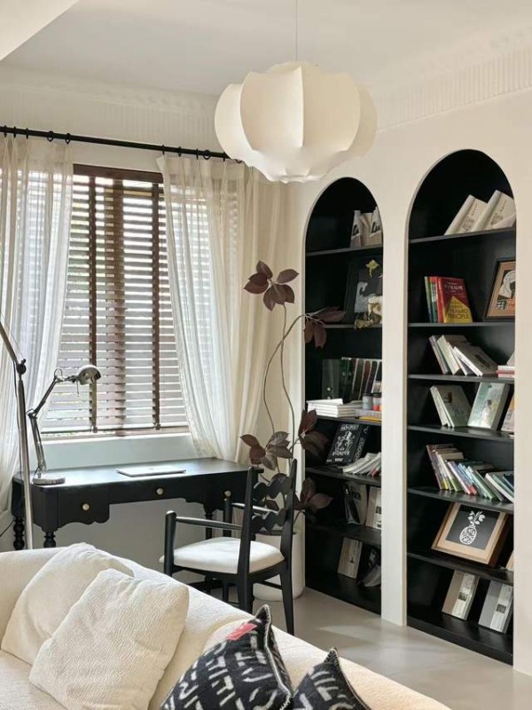 黑色细框门窗是这套空间的“点睛之笔”,无论是客厅的磨砂玻璃推拉门,还是书房的窗户边框,均采用黑色细框设计,利落的线条与暖白色墙面形成鲜明的色彩对比,瞬间提升了空间的精致感。柜体设计则以深木色为主,餐厅的餐边柜、客厅的异形实木书架、书房的嵌入式柜体均选用胡桃木色实木材质,木纹的自然肌理与黑色金属拉手形成材质对比,彰显出现代复古的质感。餐边柜的柜门采用藤编材质,藤编的镂空肌理与实木的厚重质感形成互补,既增加了柜体的透气性,又为空间增添了自然复古的韵味;客厅的异形实木书架则采用了圆形镂空设计,打破了传统书架的规整造型,成为展示藏品、书籍的艺术装置,书架上摆放的复古唱片、陶瓷摆件,进一步强化了空间的复古氛围。
