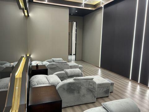 客厅作为家庭的公共区域,设计师采用了全铝制的电视背景墙和吊顶,不仅增加了空间的现代感,同时也确保了长期使用的耐久性。沙发背景墙则选用了温暖的木质纹理,与冷峻的全铝材质形成对比,营造出温馨和谐的氛围。